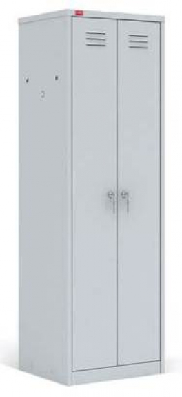 Шкаф металлический разборный двухсекционный, предназначен для хранения сменной одежды. В стандартную комплектацию каждой секции входят съемная полка для головного убора, перекладина для вешалки и крючки для одежды, врезной замок. Шкаф может комплектоваться полками для обуви и регулируемыми опорами (в комплект не входят). Полимерное порошковое покрытие светло-серого цвета (RAL 7035).